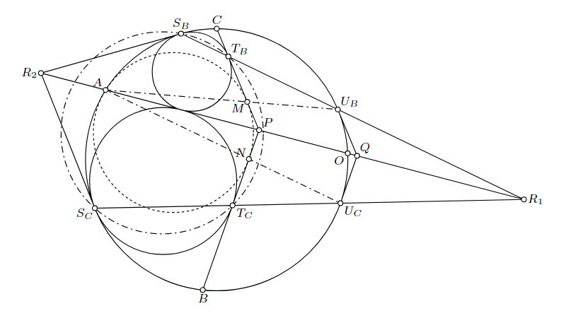 点$T_A$, $T_B$, $T_C$を上の解法と同様にとり、円$\Gamma$と円$\Omega_B$, $\Omega_C$との接点をそれぞれ$S_B$, $S_C$とする。円$\Gamma$と直線$AP$, $S_B T_B$, $S_C T_C$が再び交わる点をそれぞれ$O$, $U_B$, $U_C$とし、直線$AU_C$, $BP$の交点を$M$、直線$AU_B$, $CP$の交点を$N$とする。