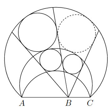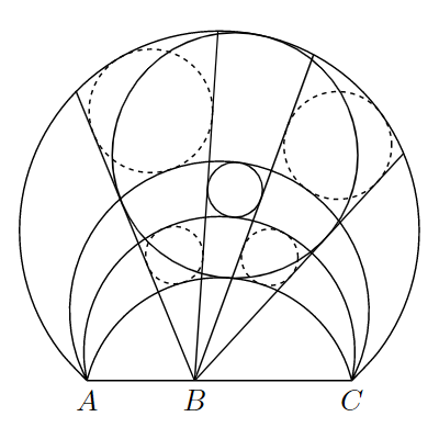 円$\omega_1$の内部に円$\omega_2$があり、2円$\omega_1$, $\omega_2$の根軸上の3点$A$, $B$, $C$がこの順に並んでいる。いま、「点$B$を端点とし$\omega_1$に接する半直線」と「点$B$を端点とし$\omega_2$に接する半直線」が2本ずつ存在するので、それぞれ$h_1$, $h_2$, $h_3$, $h_4$と名づける。また、「2点$A$, $C$を通り$\omega_1$に接する円弧」と「2点$A$, $C$を通り$\omega_2$に接する円弧」が2本ずつ存在するので、それぞれ$\gamma_1$, $\gamma_2$, $\gamma_3$, $\gamma_4$と名づける。ただし、$h_1$, $h_2$, $h_3$, $h_4$および$\gamma_1$, $\gamma_2$, $\gamma_3$, $\gamma_4$が各々この順に並ぶものとする。このとき、以下の4円がいずれも存在する。