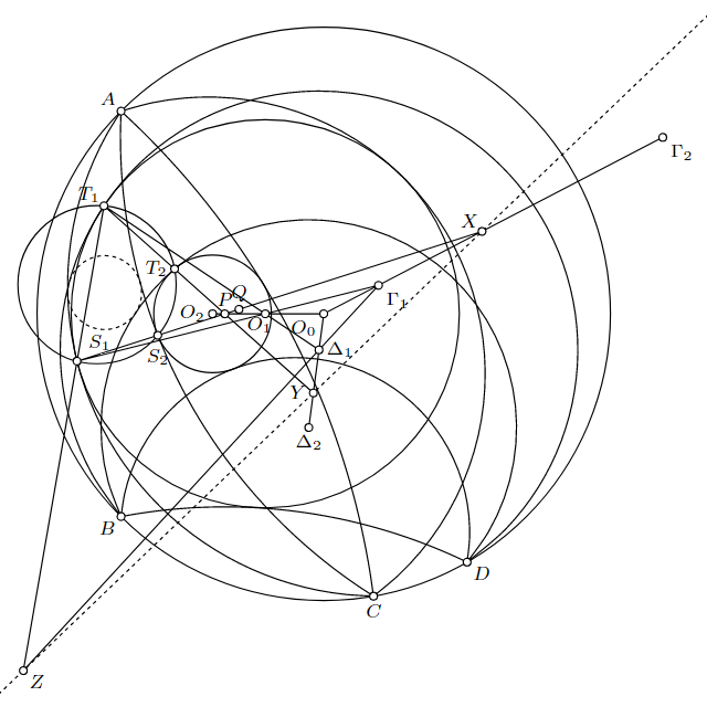 直線$S_1 S_2$, $\Gamma_1 \Gamma_2$の交点を$X$、直線$T_1 T_2$, $\Delta_1 \Delta_2$の交点を$Y$とし、直線$T_1 S_1$, $\Gamma_1 \Delta_1$の交点を$Z$とする。以降、円弧$\gamma_n$, $\delta_n$を延長して得られる円をそれぞれ円$\gamma_n$, $\delta_n$で表す($n = 1, 2, 3, 4$)。