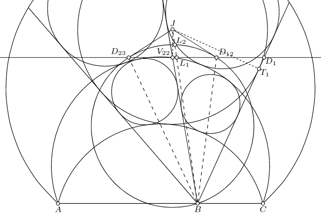 類似中線の有名性質より、2点$V_{22}$, $J$からの距離の比が$D_{12} V_{22} : D_{12} J$であるような点の軌跡(Apolloniusの円)は円$B D_{12} D_{23}$である。$\mathcal{I}_{1133}$と直線$h_1$の接点を$T_1$とおくと、