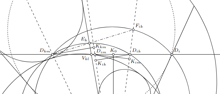 点$V_{kl}$(半直線$h_k$と円弧$\gamma_l$の交点)を通る直線$AC$の平行線$p$を引き、半直線$h_i$との交点を$D_i$、直線$\beta_{ik}$, $\beta_{im}$, $\beta_{km}$との交点をそれぞれ$D_{ik}$, $D_{im}$, $D_{km}$とする。点$B$から直線$p$に下ろした垂足を$K_0$とし、点$D_{ik}$, $D_{km}$から半直線$h_k$に下ろした垂足をそれぞれ$K_{ik}$, $K_{km}$とし、さらに点$D_{im}$から直線$h_i$に下ろした垂足を$K_{im}$とする。