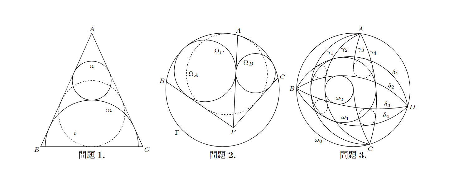 3本の円弧$\gamma_1$, $\gamma_2$, $\gamma_3$が2点$A$, $C$で交わっている。これらはいずれも直線$AC$によって定まる半平面$H$上に存在し、かつ円弧$\gamma_2$は円弧$\gamma_1$, $\gamma_3$の間を通る。線分$AC$上に点$B$をとり、点$B$を始点とする$H$上の半直線$h_1$, $h_2$, $h_3$を描く。ただし半直線$h_2$が半直線$h_1$, $h_3$の間を通るものとし、半直線$h_i$と円弧$\gamma_j$の交点を$V_{ij}$とおく。ここで、円弧$\widehat{V_{ij}V_{kj}}$, $\widehat{V_{kl}V_{il}}$および線分$V_{kj}V_{kl}$, $V_{il}V_{ij}$によって定まる領域を$\widehat{V_{ij}V_{kj}}\widehat{V_{kl}V_{il}}$で表し、この領域内の円であって4本の境界線すべてに接する円が存在するとき、「$\widehat{V_{ij}V_{kj}}\widehat{V_{kl}V_{il}}$は$\mathit{circumscribed}$である」ということにする。$\widehat{V_{11}V_{21}}\widehat{V_{22}V_{12}}$, $\widehat{V_{12}V_{22}}\widehat{V_{23}V_{13}}$, $\widehat{V_{21}V_{31}}\widehat{V_{32}V_{22}}$がいずれも$\mathit{circumscribed}$であるならば、$\widehat{V_{22}V_{32}}\widehat{V_{33}V_{23}}$も$\mathit{circumscribed}$であることを示せ。