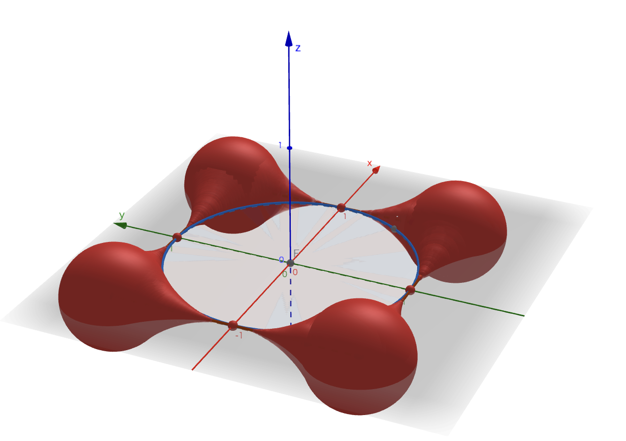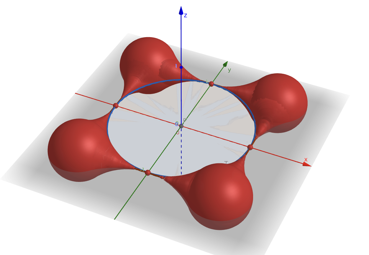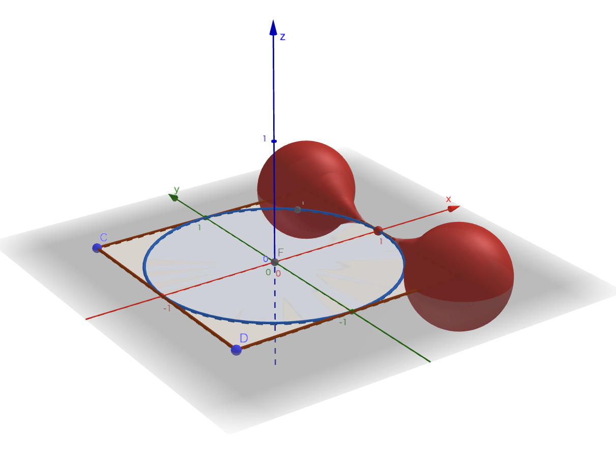 表示の関係上、軸上で点$P$がそのまま描画され、小さい球のようなものが存在するように見えてしまっているが、ここは半径$0$である。