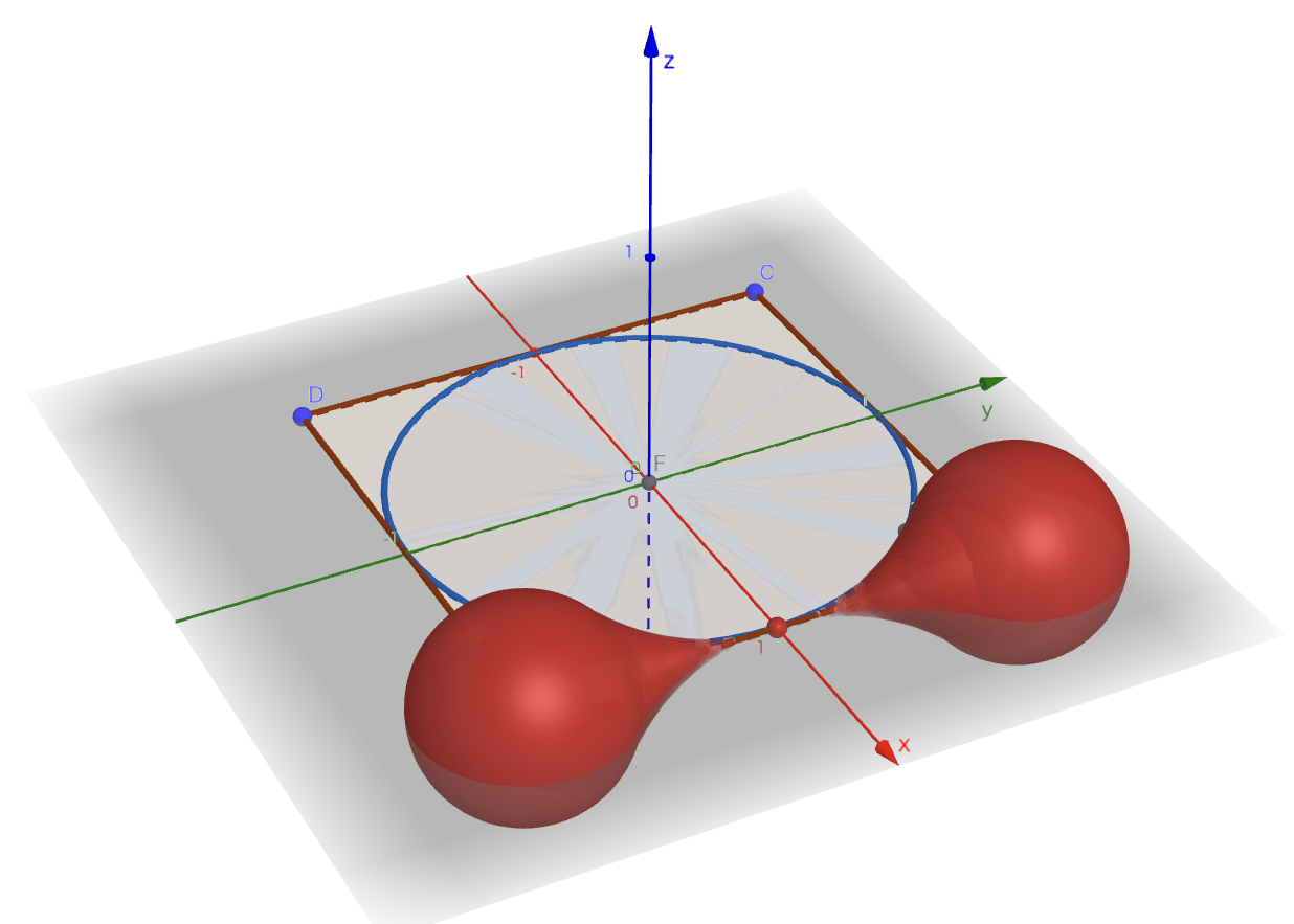$A\;(1,-1,0),\;B\;(1,1,0),\;C\;(-1,1,0),\;D\;(-1,-1,0)$の$4$点を頂点とする正方形$ABCD$がある。また、平面$ABCD$上で正方形$ABCD$に内接する円を$K$とする。