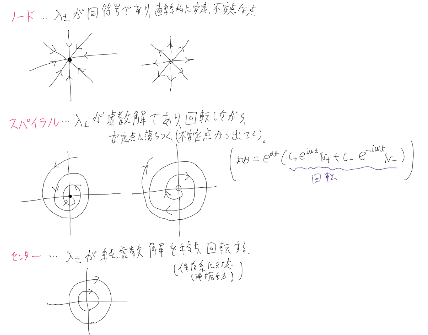 これらの図から分かる通り、微分方程式を線形化したときの行列の固有値によって、固定点を分類することができるのです。