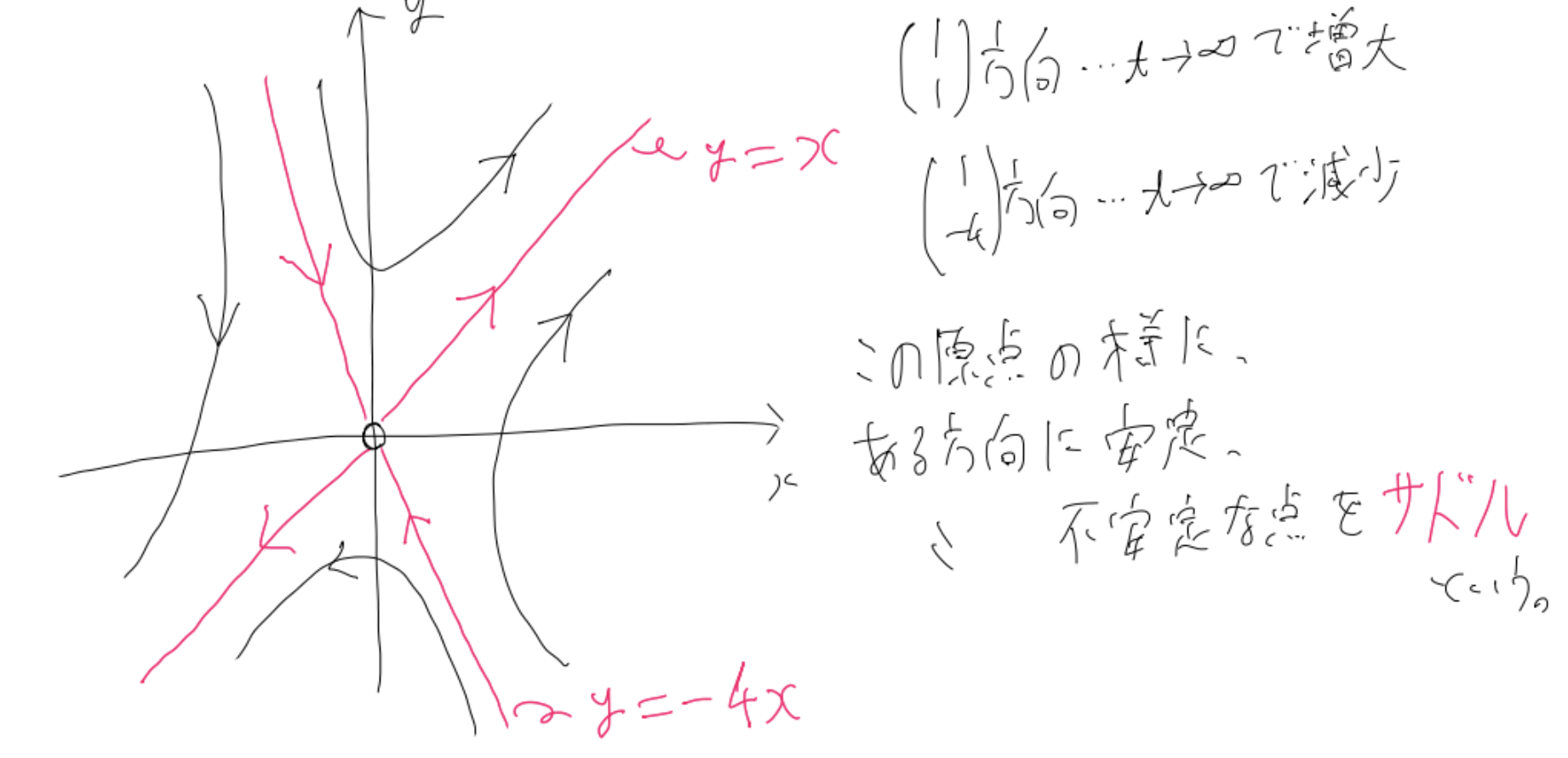 この図からも分かる通り、$A$の固有値が正の方向には固定点から離れるような、負の方向には固定点に近づくような挙動をします。
