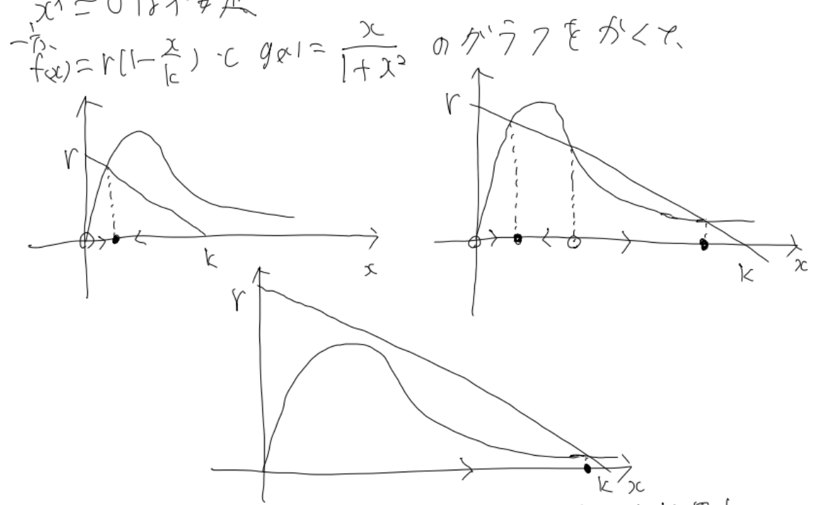 この系の固定点つまり時間微分が0になるような値$x^*$は$x^*=0$と、$r(1-\frac{x^*}{k})=\frac{x^*}{1+x^{*2}}$の解です。