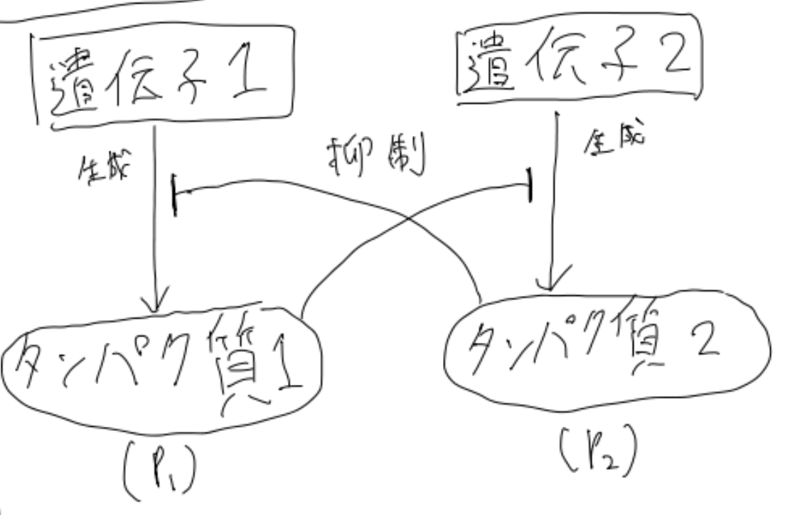 こちらは「トグルスイッチ」と呼ばれるものです。簡単にいうと、タンパク質1がタンパク質2の、タンパク質2がタンパク質1の生成をそれぞれ抑制する、という系をモデル化したものです。