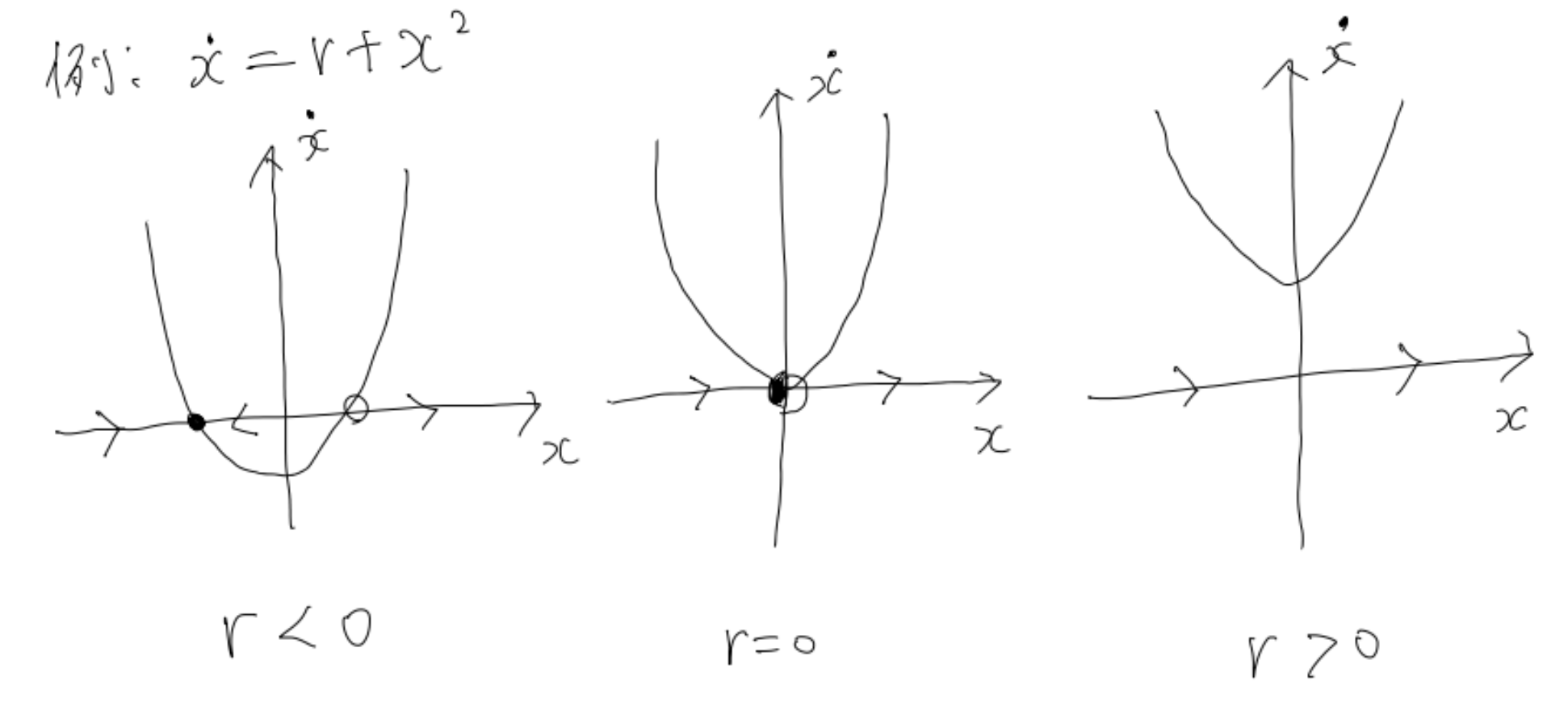 この図からも分かる通り、$r$が負のときは安定固定点が存在する一方、正になると消失し常に解は発散してしまいます。