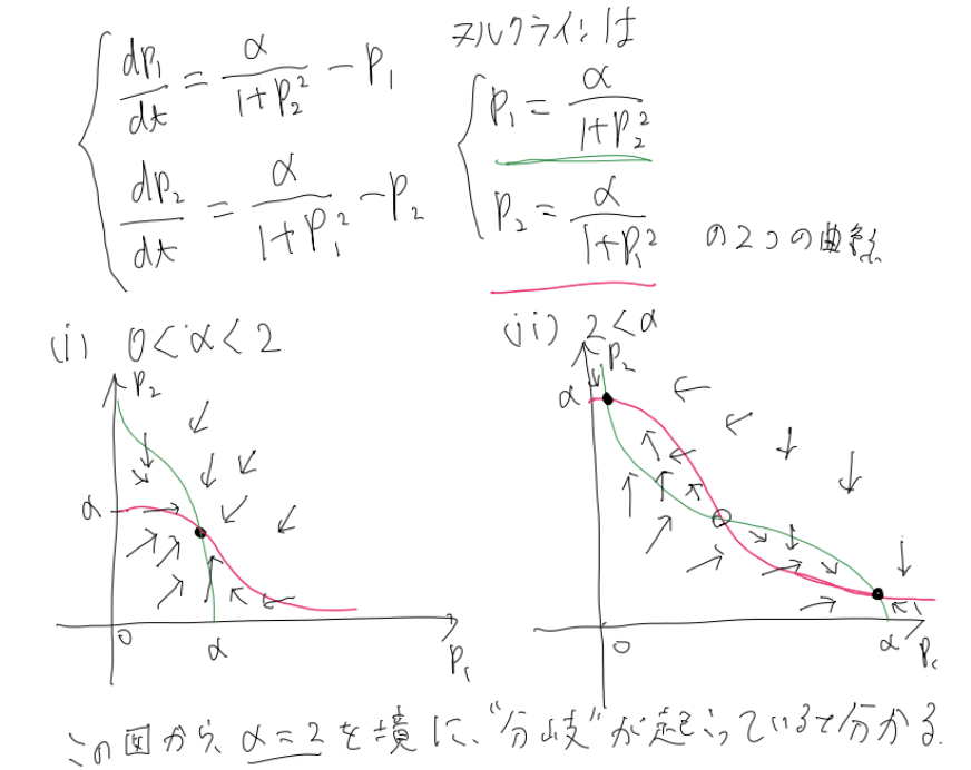 この図から分かる通り、$\alpha$というパラメータの値に応じて、2つのタンパク質が同じくらい生成されているか、あるいは片方が多く生成されているか、という状態が変化しています。