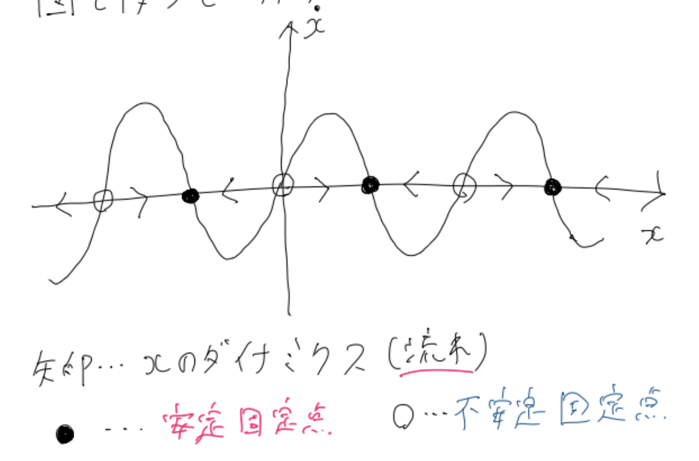 これをみると一目瞭然。十分時間が経過した後に$x$は$x$軸上の黒丸で表される「安定固定点」に行き着きます。どの安定固定点に行き着くかは初期値次第ですね。