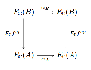 上の図式が可換になる、すなわち $\alpha_A\circ F_\mathbb{C}(f^{op})=F_\mathbb{C}(f^{op})\circ \alpha_B$が成り立つことを示せばよい。