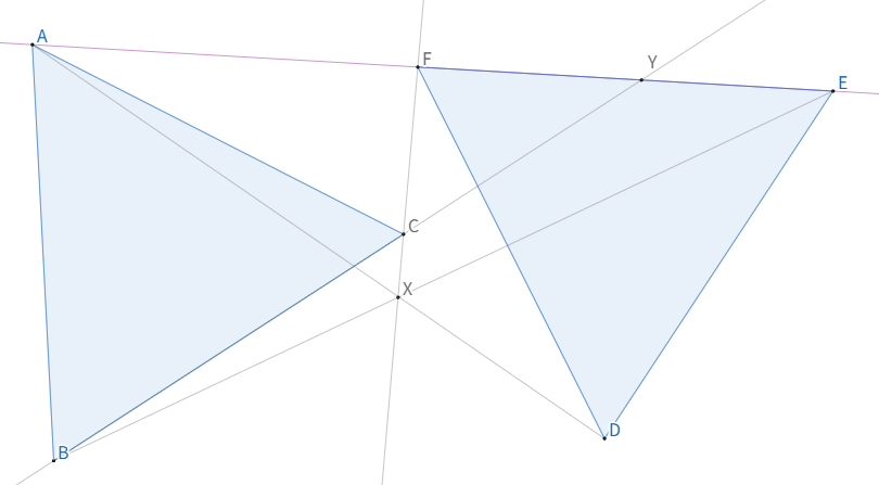 三角形$ABC$と三角形$DEF$がこの順に対応していると考えます。三線$AD,BE,CF$が点$X$で交わっているため、$AB\cap DE=Z,CA\cap FD=W$とするとデザルグの定理より三点$YZW$は共線です。