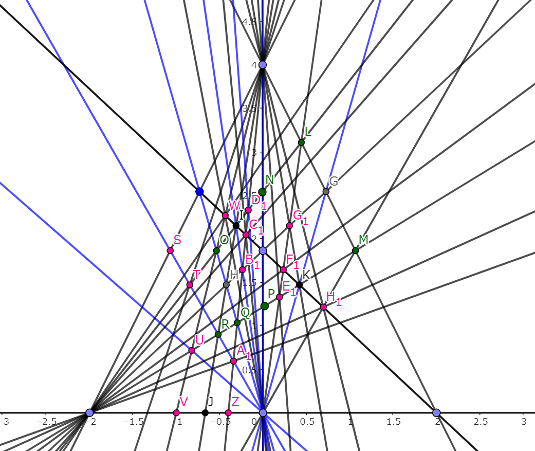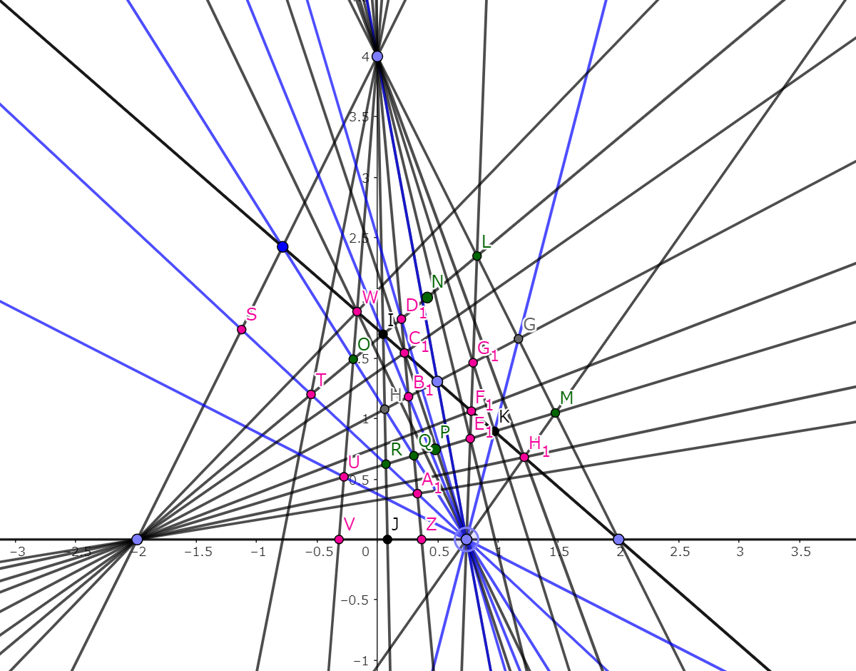 これがなぜ起こるのかというと、もともとこの図形において動点となるのはおおもとの三角形のみであり、それ以外の点は定点となることで線分比を変えたとしても、図形としての情報(三角形、四角形など)は失われることはないからである。