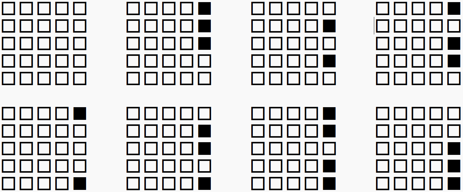 で全てです。最初のものはすでに解けているので良いとして、残りの7つについて、右から2列目のみが光っている状態に変化させられることを確認します。