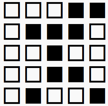 katsubiさんによる$5 \times 5$ライツアウトの解法を紹介し、その解法が正しいことを証明します。まず解法を述べます。ただし、ここでの話に合うように向きを回転させています。
