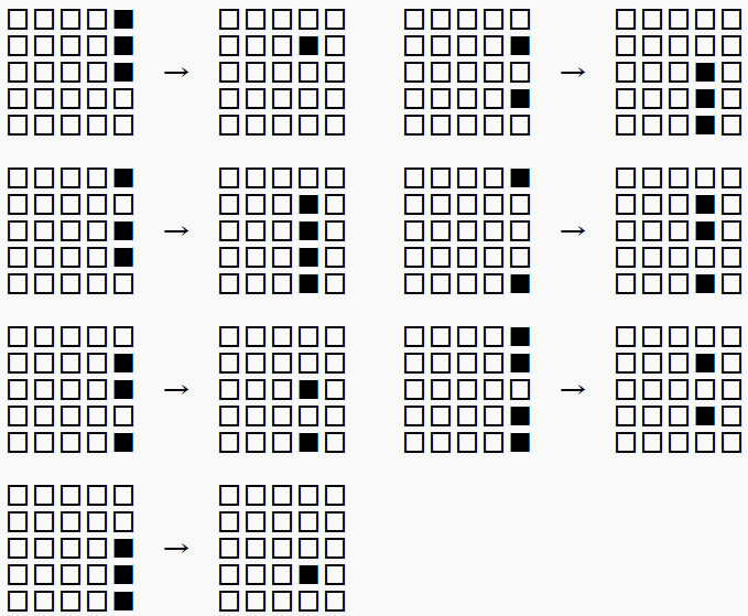 となります。この操作により、左端の列のライトがすべて消えます。この操作を1,2列目で右寄せと呼ぶことにしましょう。ここからさらに2,3列目、3,4列目、$\cdots $ と続けて右寄せを行うと、最後には右端の列のみにライトが残った(もしくはライトがすべて消えた)状態になります。このように右端まで右寄せを行うことを、端まで右寄せと呼ぶことにします。