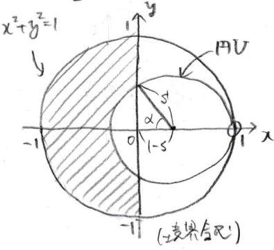 $\therefore \rm{Q}$の条件は,「原点を中心とする半径$1$の円の周および内部」かつ「点$(1-s,\ 0)$を中心とする半径$s$の円の周および外部」 (ただし点$\rm{B}$を除く) (図示略)